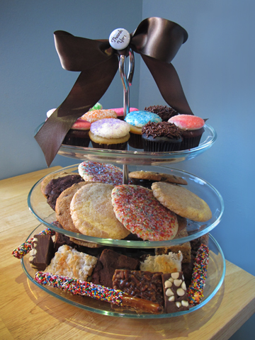A reusable three-tier glass tower ready for immediate display is filled with an assortment of mini cupcakes, brownies, bars, cookies and confections. The tower is wrapped in cello and tied with a satin ribbon and is the ideal gift for a small office or party.