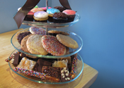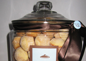 An old-fashioned apothecary glass jar filled with cookies, brownies or a combo of two, scones or doughnut muffins.